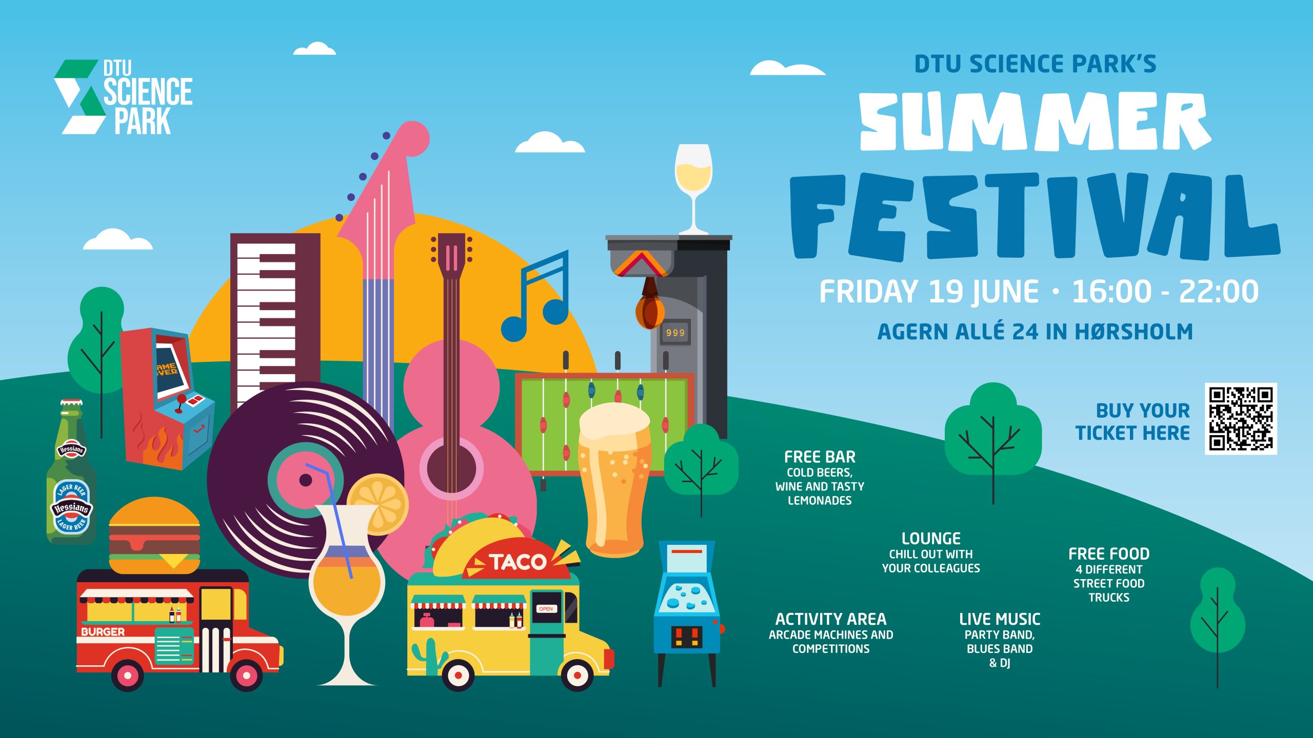 Friday, 19 June from 4:00 PM, the large parking areas in front of Agern Allé 24 in Hørsholm will be transformed into one big festival ground with tents, pavilions, street food trucks, a DJ, live bands, an entertainment tent with arcade games, and much more. We are hosting DTU Science Park’s very first Summer Festival 🥳🎊🪩