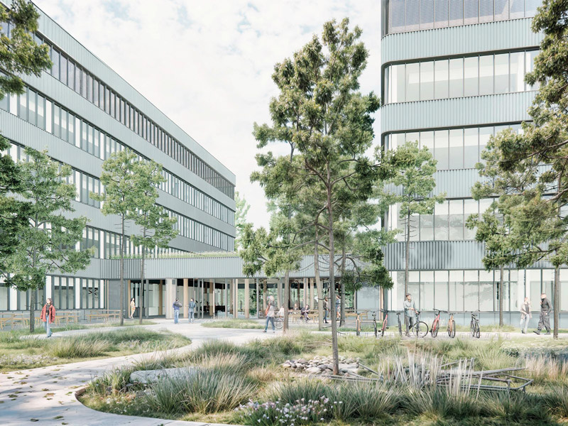 The project consists of two wing buildings connected by a lower central structure housing a lounge and kitchen. The design emphasizes flexible floor plans, and the interior will combine office and laboratory spaces, allowing the building to be adapted to a wide range of needs.